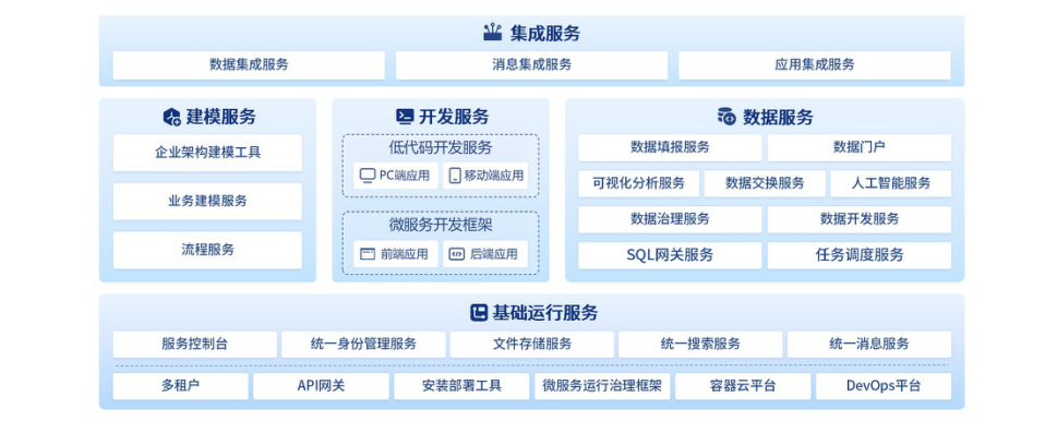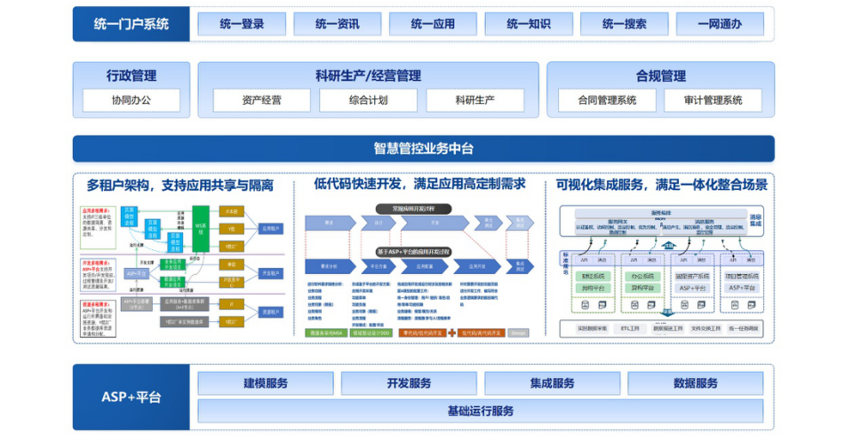 ASP+基础运行服务:提供了云原生、微服务、组件化、服务化等基础运行环境和可复用的基础技术组件、可共享的技术服务,为用户业务系统建设,从平台层面实现环境适配能力和全面安全保障能力。