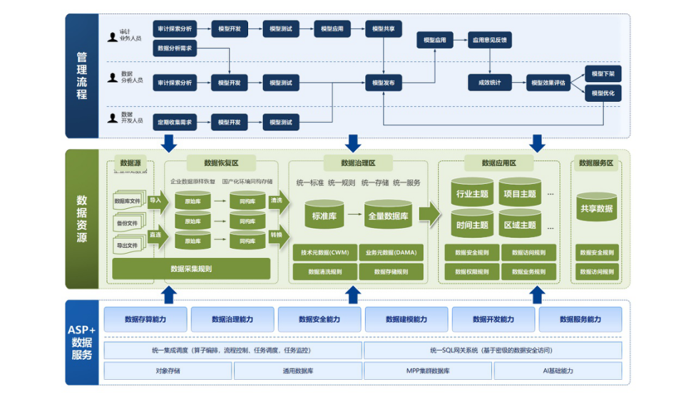 ASP+数据服务:围绕数据仓库、数据湖、湖仓一体等技术体系,提供了全技术栈、全链路的大数据存储、开发、治理能力,打通了涵盖数据集成、存储、治理、建模、分析、挖掘和服务在内的数据处理全生命周期管理能力,实现了各种数据资源的共享、协同、服务。