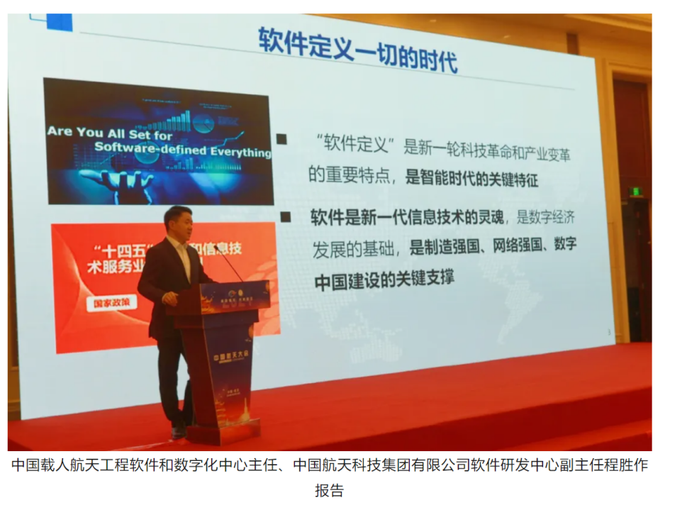中国载人航天工程软件和数字化中心主任、中国航天科技集团有限公司软件研发中心副主任程胜作题为《构建航天软件研制新体系——打造航天软件新质生产力》的报告。阐述了国内外软件行业发展概况以及我国航天软件面临的严峻形势和挑战,提出了建立智能时代航天软件研制新体系的战略规划和体系规划。