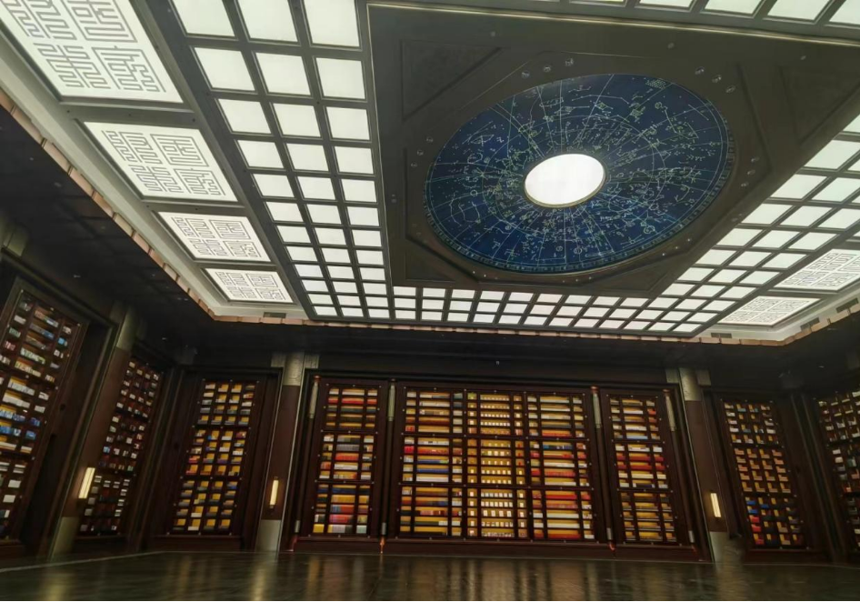 在主建筑文华堂,穹顶之上,取自宋代石刻天文图的满天星宿点缀其中,寓意中华文明如星空般浩瀚璀璨。环视四周,15组书柜、3万余册古今经典汇成文山字海,彰显厚重文化底蕴。