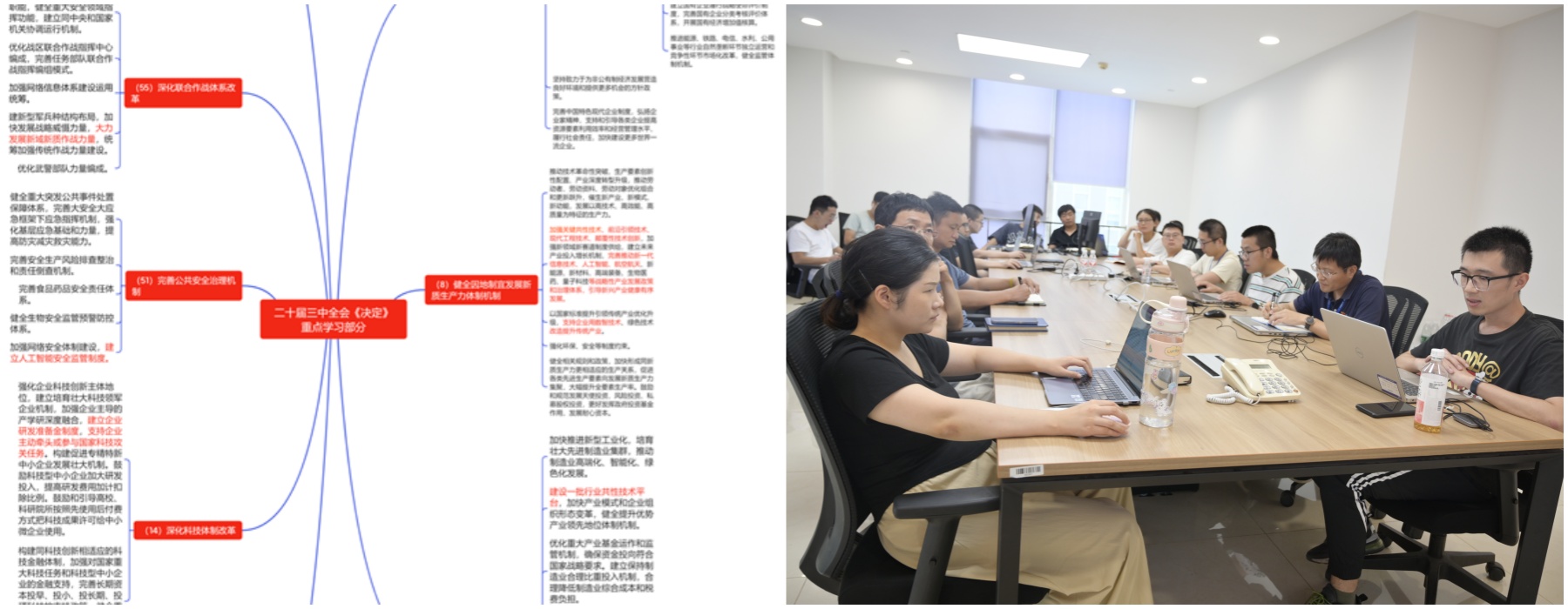 第六党支部通过脑图重点学习了《中共中央关于进一步全面深化改革、推进中国式现代化的决定》。支部同志们筛选与业务工作紧密相关的8个章节,结合学习脑图重点学习了《决定》,深刻领会了《决定》是当的历史上又一次纲领性文件,具有划时代的意义。党员同志们还学习了国有企业在落实《决定》过程中应遵循的重大原则。通过此番学习,全体党员对《决定》的内容精髓及其深远意义有了更为透彻的理解与把握。