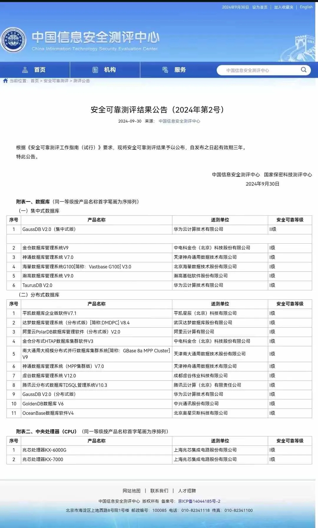 9月30日,中国信息安全测评中心、国家保密科技测评中心发布了《安全可靠测评结果公告(2024年第2号)》。神软子公司神通公司的集中式数据库产品神通数据库管理系统 V7.0、分布式数据库产品神通数据库管理系统(MPP集群版)V7.0通过测评,获得安全可靠等级“I级”。