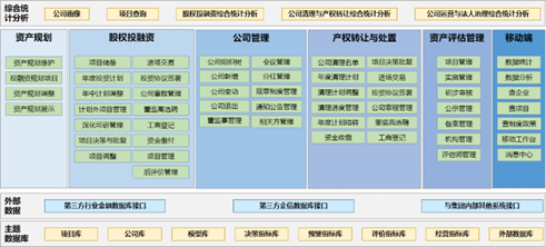 系统包含资产规划管理、投融资管理、公司管理、产权转让与处置管理、资产评估管理、综合统计分析6大模块和1个移动端应用,满足国家信息系统分级保护和等级保护的相关要求。