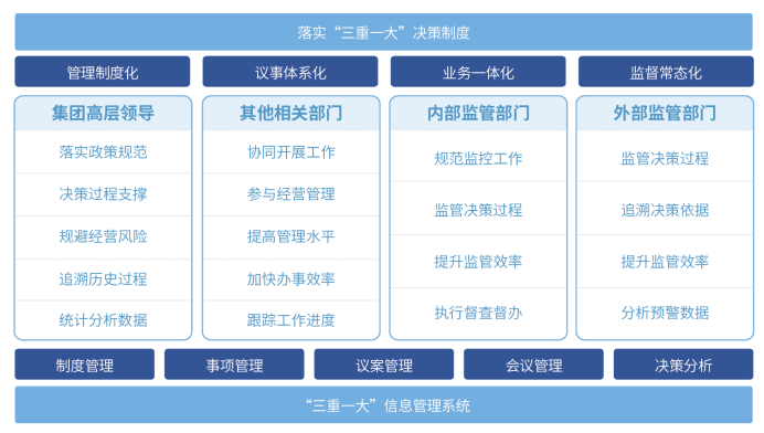 神软针对企业落实“三重一大”所面临的挑战,助力企业构建集团及各级法人单位全级次的“三重一大”决策运行管理系统,通过全景监控、全程跟踪,全面信息反馈和全部痕迹保留支撑企业切实将“三重一大”落实到实处。针对不同类型用户提供个性化、定制化的功能和服务,满足外部监管要求与内部管理要求,从而使公司治理规范化、管理制度化、监督常态化,建立健全“三重一大”科学决策、高效执行、有效监督的工作体制和机制,防范决策风险。