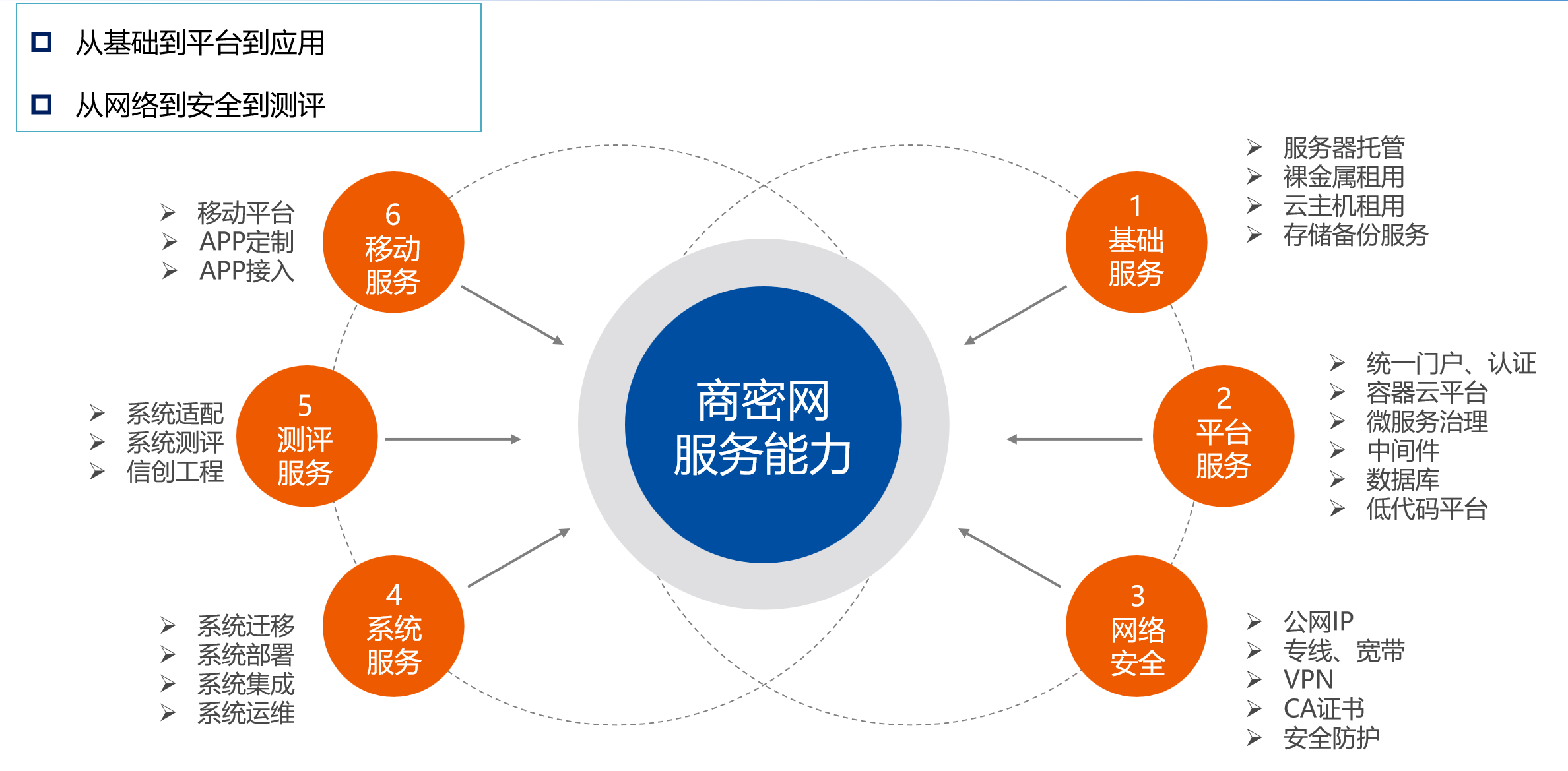 商密网云数据中心建设及服务理念,贴合集团型企业经营管理、科研生产特点,实现全新信息技术与管控模式变革的深度融合,创新服务理念、优化资源配置、增强安全防控、降低运营成本,不仅能够提供基础、网络、安全、云平台、中间件、数据库等基础服务,随着生态体系的不断完善,也能够提供软件服务。